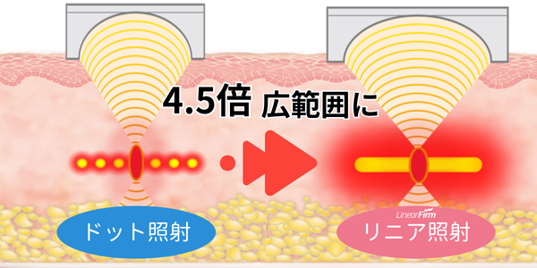 ハイフ治療は通常ドット=点状に超音波エネルギーの熱が照射されるものが一般的ですが、リニアファームでは、リニア=線状に照射することが可能になりました。