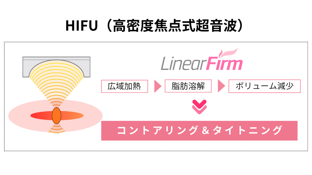 脂肪吸引や脂肪溶解注射などの手術や薬剤を使用する方法とは違い、HIFU(高密度焦点式超音波)という特殊な超音波エネルギーを利用することで脂肪細胞を溶解し、局所的なボリュームダウンを可能にした最新のハイフ治療です。